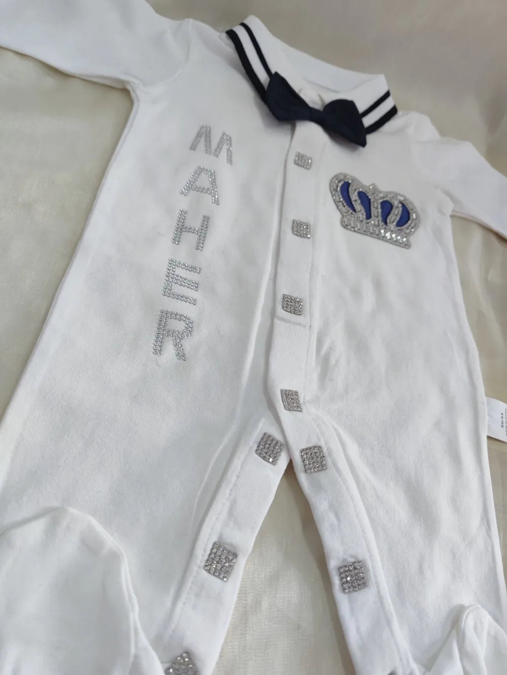 • Design: solid royal blue romper with covered-button closure and matching bonnet