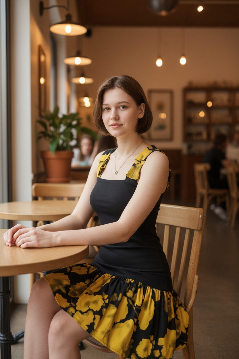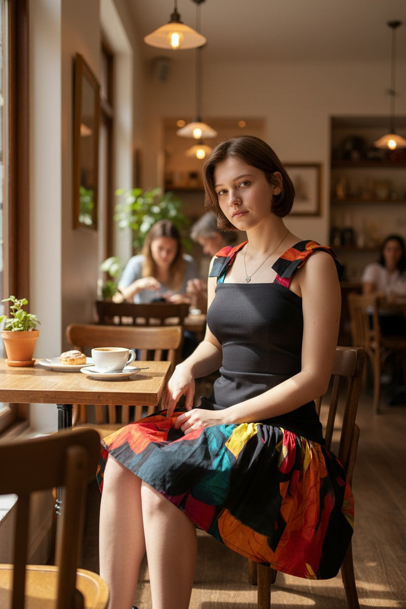 A lightweight summer mini dress designed with a tie-dye printed patchwork and a wide swing A-line silhouette. The inclined-shoulder slash neckline and medium-stretch fabric create an easy shape suited for warm-weather outings and events.